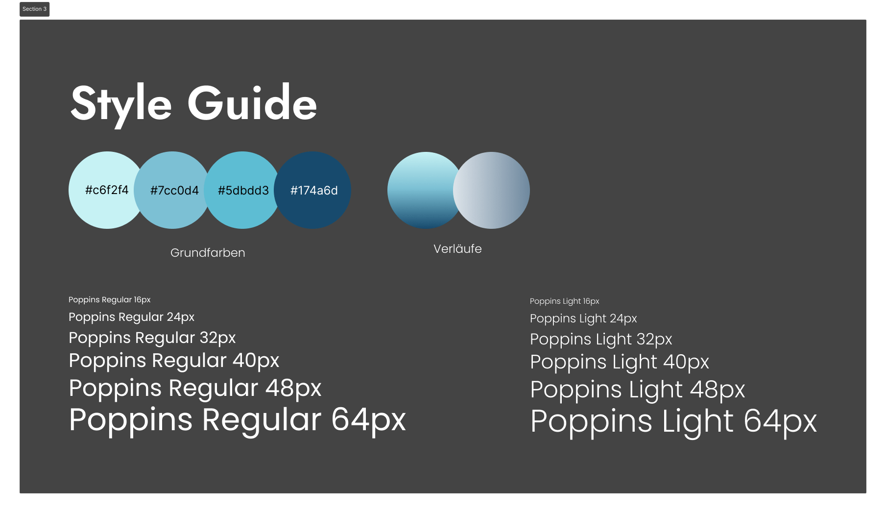 Das blaue Farbschema vermittelt ein klares, modernes und steriles Design, das ideal für eine Health-Tech-App geeignet ist. Die serifenlose Schriftart Poppins ergänzt dies mit ihrer leichten Lesbarkeit und ihrem schlichten, klaren Erscheinungsbild.